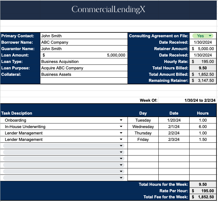 Tracking of Consulting Time Spent & Retainer Money – We commit to providing our clients a weekly update and tracker to show all time spent on your behalf and the hourly rate charged for those hours for our consulting work. Each week you will see how your initial retainer funds are being utilized, and what the remaining balance is left on that retainer. Should your deal be complex and you use up the full retainer, we will let you know and you can decide if you would like to continue moving forward to pursue financing options by submitting an additional retainer to CLX, or if you would like to end our consulting agreement and part ways.